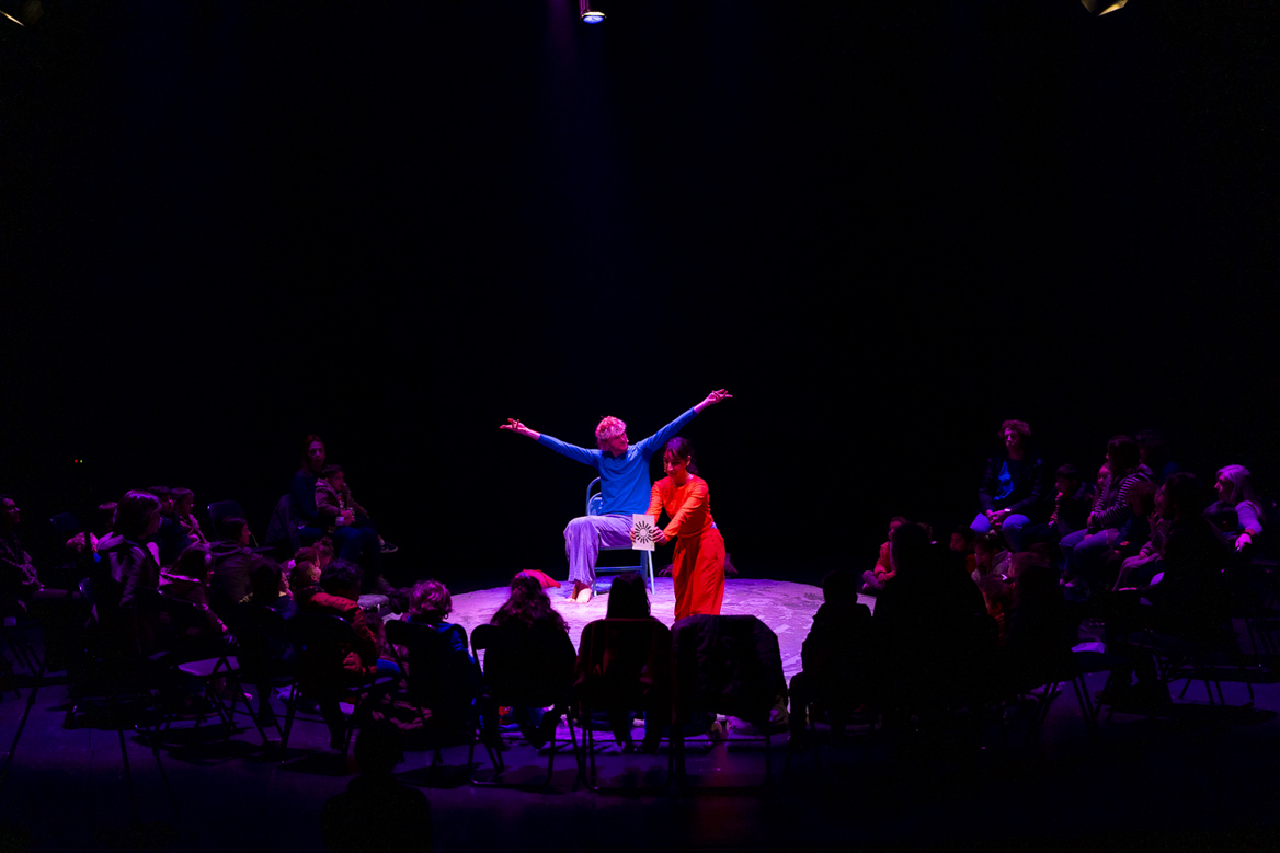 The set design sought to remove material elements and highlight the invisible space suggested by the protagonists and their movement. The different worlds that unfold throughout the play become the product of a co-construction of the imagination, in a close complicity between performers and spectators.