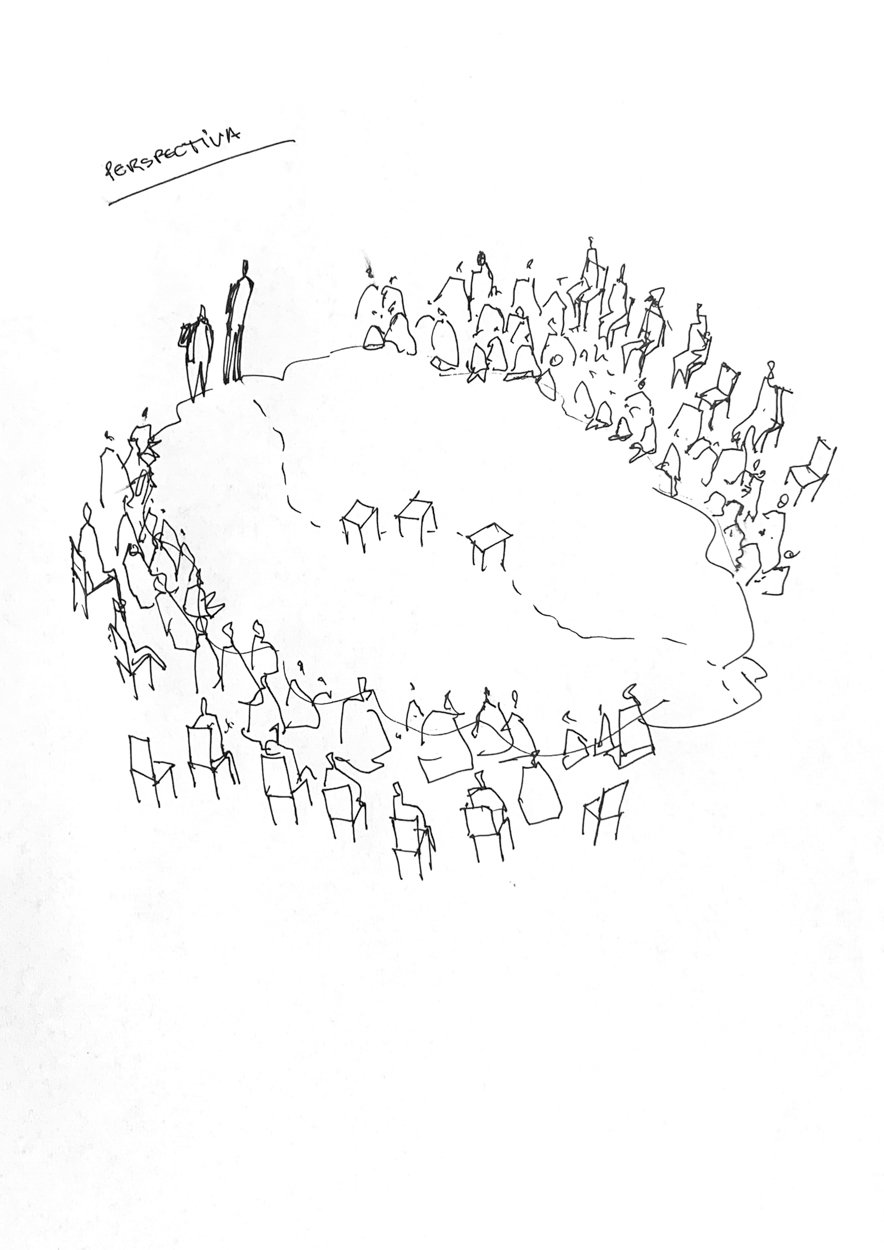 A delimitação do chão é também uma forma de construir a relação com/entre as pessoas à sua volta. Rodeando-se primeiro ao seu nível com almofadas do mesmo tecido e numa segunda fila com cadeiras. Esta segunda linha mais alta permite fechar e conter o espaço de forma intimista (como uma taça).