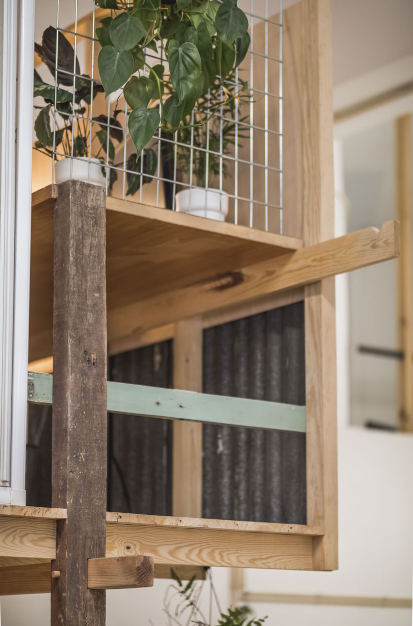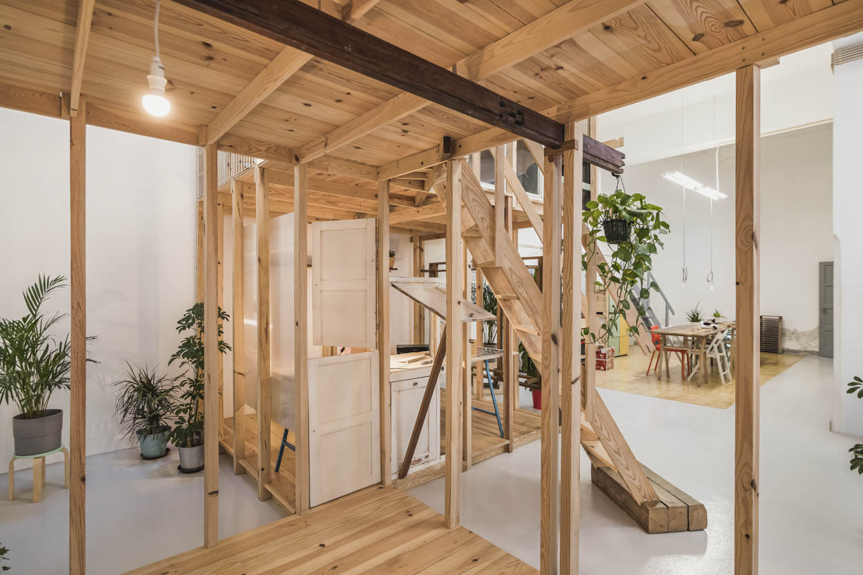 In the second design phase we collected a truly diverse set of old parts from demolitions that were then used to shape and hack the basic spatial scheme. The naked wood structures were thought as the hardware of the space to be then contaminated by use. The aim was that this diversity would expand the overall space into a bigger amount of small experiences and environments within the larger environment. A set of little micro-cosmos where different materials, textures and details respond to the specific use as well as the scale of the body.